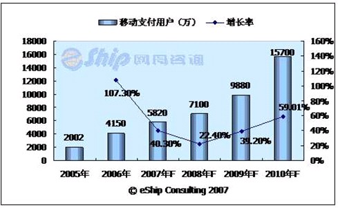 移動支付,也稱為手機支付,是允許用戶使用其移動終端(通常是手機)對所消費的商品或服務進行賬務支付的一種服務方式。據調查數據表明:預計在2010年,移動支付在中國用戶總數將突破1.5億,從2006年到2010年的年均復合增長率為18.54%。