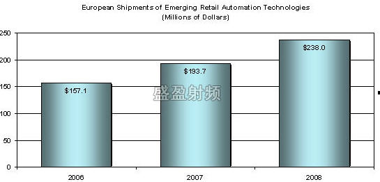 據VDC(Venture Development Corporation-風險投資開發公司)公司的一項最新調查,新興技術(如電子貨架標簽、RFID、自動收費設備)在歐洲零售業自動化市場的銷售量2006年已經超過1.57億美元。VDC的零售業自動化設備規劃服務部預計這個市場的年綜合增長率為23%,到2008年年收入可以達到2.38億美元。雖然近期傳統技術在市場仍然占據主導地位,但出于技術更新周期、終端用戶滿意度提高、銷售價格快速下降等原因,新興技術會保持長時間的增長勢頭。現場調查證明采用新興技術以后的用戶都得到滿意的投資回報也進一步佐證上述結論。