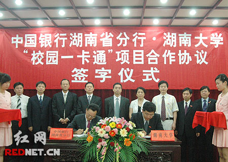 今天上午10時30分,中國銀行股份有限公司湖南省分行、湖南大學在長沙簽訂“校園一卡通”項目合作協(xié)議。該項目建設總投資960萬元,首期合作時間為6年。