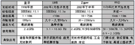 目前,IEEE、ITU和HomeRF等組織都致力于WPAN標準的研究,其中IEEE組織對WPAN的規范標準主要集中在802.15系列。802.15.1本質上只是藍牙底層協議的一個正式標準化版本,大多數標準制定工作仍由藍牙特別興趣組(SIG)完成,其成果由IEEE批準,原始的802.15.1標準基于Bluetooth1.1,目前大多數藍牙器件中采用的都是這一版本。新的版本802.15.1a對應于Bluetooth1.2,它包括某些QoS增強功能,并完全后向兼容。802.15.2負責建模和解決WPAN與WLAN間的共存問題,目前正在標準化。802.15.3也稱WiMedia,旨在實現高速率,原始版本規定的速率高達55Mb/s,使用基于802.11但與之不兼容的物理層。后來多數廠商傾向于使用802.15.3a,它使用超寬帶(UWB)的多頻段OFDM聯盟的物理層,速率高達480Mb/s。并且生產802.15.3a產品的廠商成立了WiMedia聯盟,其任務是對設備進行測試和貼牌,以保證標準的一致性。802.15.4也稱Zigbee技術,主要任務是低功耗、低復雜度、低速率的WPAN標準制定,該標準定位于低數據傳輸速率的應用。附表給出了各種技術之間的比較。