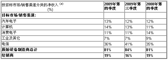 2009年第四季度意法半導體凈收入總計25.83億美元,包括意法半導體合賬的ST-Ericsson的銷售收入。凈收入環比增長13.6%,反映了意法半導體所有目標市場和所有地區市場的需求增長,特別是日本、大中國區和美洲區的需求增長更加強勁。除消費電子和工業以外的所有目標市場以及除日本以外的所有地區市場,凈收入均為同比增長,反映了半導體市場出現普遍復蘇跡象。