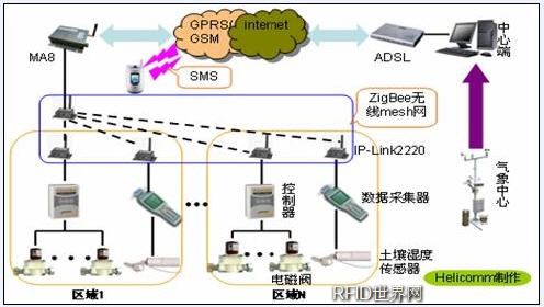 解決方案 如圖所示,首先在灌溉區(qū)域用Helicomm的IP-Link2220架設出無線mesh網(wǎng),每一個IP-Link2220連接一個區(qū)域的控制器和電磁閥,控制這個區(qū)域的灌溉,最后連接到Master(IP-Link2220)和GPRS,GPRS與遠端PC通過GPRS網(wǎng)絡和Internet互聯(lián),從而實現(xiàn)灌溉的遠程控制。另外此系統(tǒng)的主要目的在于節(jié)約灌溉用水,提高灌溉效率,所以在灌溉區(qū)域最好配置田間濕度傳感器與接入mesh網(wǎng)的IP-Link2220(或GPRS)相連,以便遠端控制室能夠采集灌溉區(qū)域的土壤濕度信息,配合氣象站的氣象信息,對灌溉時間做出合理的判斷,進而達到高效節(jié)水灌溉的目的。