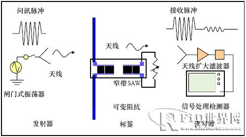 當(dāng)一個SAW標(biāo)簽制造完畢, 有許多微小金屬反射器附在到壓電晶體上。 每個標(biāo)簽的反射器排列都不一樣。 當(dāng)聲波在壓電晶體里傳播里,它會按照反射器產(chǎn)生的模式, 通過閱讀器的數(shù)字信號處理器轉(zhuǎn)換成唯一一個ID號。雖然金屬和液體還是會減緩閱讀器發(fā)射激活SAW標(biāo)簽的2.45 GHz RF信號強度,但標(biāo)簽里的壓電晶體消耗信號的能量遠(yuǎn)遠(yuǎn)少于集成電路, 這樣使得表面聲波標(biāo)簽可以生成比硅標(biāo)簽更強的反向散射信號,克服金屬和液體的減緩效應(yīng)。