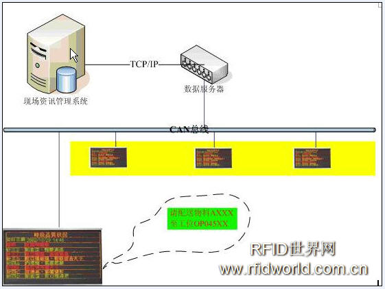 操作工根據自己的操作需求及所發生問題,通過觸發身邊的按燈終端將信息實時傳送至現場資訊管理系統,系統接到訊息后按一定的規則進行識別,并即時將處理后的信息發送至LED屏幕上,如:請配送物料XXXX至工位XXX上。管理人員看到信息后馬上通知物料配送人員將物料送至線邊。