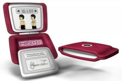 如圖所示為一款叫做eWallet的電子錢包概念設計。其內置了WIFI和RFID無線連接模式,能夠在商店或者是餐館等消費場所同步購物系統,進行商品選擇和調配,而且內置了模擬器來展示選擇結果,比如購買衣服時的展示。其不但具有筆記簽名欄來確認購買等操作,而且還具有雙屏的鍵盤來方便用戶輸入選擇。