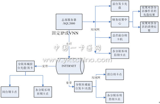 金神話如樂城有五個(gè)娛樂場所,包含:KTV、網(wǎng)吧、溜冰場等等,整套系統(tǒng)建立在總部局域網(wǎng)與連鎖店的VNN虛擬VPN上運(yùn)行。采用感應(yīng)IC卡為介質(zhì),實(shí)現(xiàn)連鎖娛樂城消費(fèi)一卡通。