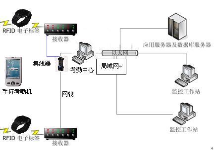 該圖中,讀卡器讀取到犯人佩戴的電子標簽信息,然后定時的通過以太網線的方式或者通過手持機無線局域網的形式將信息傳輸到管理中心,管理中心配合相關軟件對信息進行處理,必要時通過權限設置產生報警。