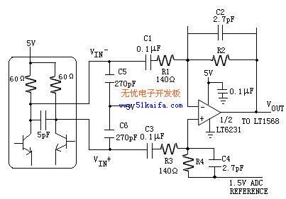 由圖2可知,在60Ω電阻器的兩端增設270pF外部電容可將解調器的輸出限制為10MHz,以防止任何高頻干擾傳送至LT6231放大器。由于幅移鍵控RFID信號無需DC偶合,因此對基帶放大器采用了AC偶合。其中 AC偶合電容器和放大器輸入電阻器提供的高通極點被設定為8kHz,差分放大器的輸入電阻其電阻值被設定為140Ω,可以最大限度地降低與輸入相關的噪聲。
