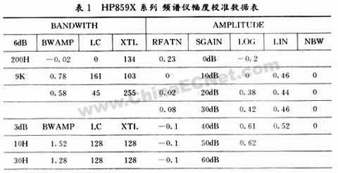 HP859X系列頻譜儀不僅能對儀器各種指標進行校準,而且還能將各種校準數據存貯在內存里,便于操作和維修人員進行參考。只要進入維修菜單,就能將校準數據顯示出來。具體步驟是:按下菜單〔CAL〕,(MORE),(MORE),(SERVICEDIAG),(DISPLAYCALDATA),這時頻譜儀的幅度校準表將顯示在屏幕上,如表1所示。表1是HP8593E頻譜儀出廠的典型幅度校準數據表。