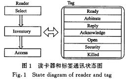 在EPC C1 G2的協(xié)議中,reader通過三種基本操作:Se—lect,Inventory和Access管理標簽群.同時根據讀卡器的操作,標簽工作于七種狀態(tài)模式:Ready,Arbitrate,Reply,Ac—knowledged,Open,Secured和Killed.其中處于Killed狀態(tài)下的標簽,將處于死亡狀態(tài),不可被喚醒,如圖1讀卡器和標簽通訊狀態(tài)圖所示.