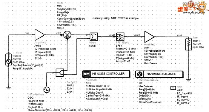 ?。?)在元件模型列表窗口中找到Sources-Freq Domain項目,插入OSCwPhNoise,作為本振源。設(shè)定Freq=915MHz,修改PhaseNoise list,如圖1所示。OSCwPhNoise已經(jīng)自帶了50Ω的電阻,這和V_1Tone加50Ω的電阻功能類似,就是多了相位噪聲。