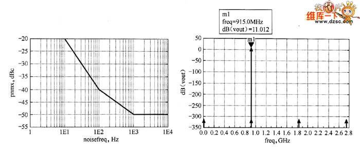 完成全部設(shè)置后運行仿真。在數(shù)據(jù)顯示窗口中把vout_phmx顯示出來,如圖5所示,可以看到相位噪聲在發(fā)射機輸出端的分布情況,同時也可以得到輸出信號的頻譜特性。