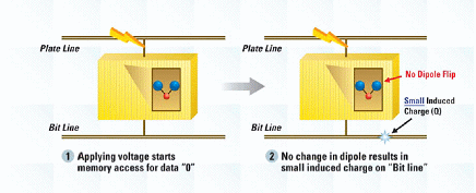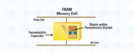 如圖2所標示,FRAM的記憶格包含由電路板線及位線連接的鐵電電容。在鐵晶體管中的雙極形成電容材料可經由外部電壓跨越任一條線加以設定或逆轉。