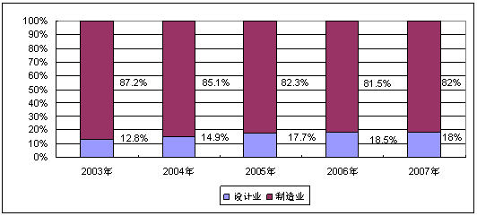圖2 2003-2007年中國集成電路設(shè)計業(yè)在產(chǎn)業(yè)整體所占份額增長情況