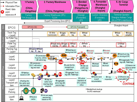 EPCglobal產業行動小組(Industry Action Group)之下運輸物流服務全球先導工作小組(TLS Global Pilot Task Group),希望透過跨國、跨產業合作模式,來協助各國有興趣產業導入使用EPC/RFID相關標準,驗證GS1 識別標準、EPC/RFID技術組件與EPCIS系統應用可行性。從2006年開始規劃三階段Pilot計劃,2007年2月完成Pilot第一階段測試作業,作業范圍是從香港貨物拼裝中心(貨棧)到日本港之海運整柜貨物運輸導入EPC/RFID測試;第二階段擴大作業范圍即貨物運送由中國托運人杭州倉儲出發,送至中國上海機場至美國長堤收件人倉儲,中間于日本Narita機場轉運之空運拼裝柜運輸導入EPC/RFID測試,也于今年(2008)2月完成整個Pilot計劃測試作業,耗資超過1百40萬美金。以下針對第二階段Pilot計劃執行過程作一摘要介紹。