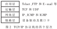 由于單片機的資源有限,本子系統針對一卡通系統的要求簡化了TCP/IP協議棧,只需實現系統必需的功能即可。TCP/IP協議棧有四個層次,分別為鏈路層、網絡層、運輸層和應用層,如圖2所示。下面對簡化協議棧逐層說明。
