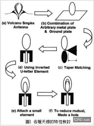 圖2是UWB天線的結構設計范例,如圖所示假設最低使用頻率的波長為Wz時,大型橢圓狀原件與倒U字形原件的高度大約是1/4Wz,本設計分別使用0.23與0.22波長。