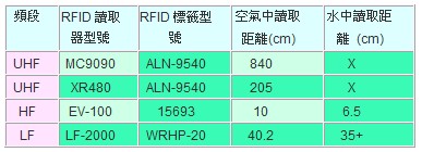 表1、RFID各頻段(UHF、HF、LF)之水中讀取距離測試