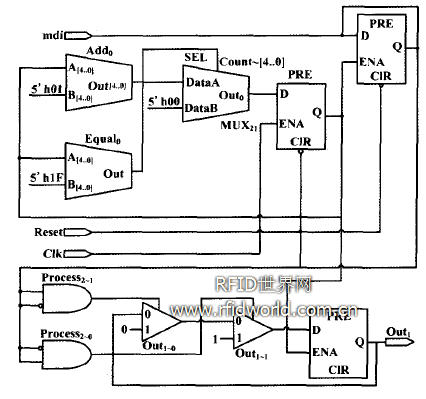 閱讀器的工作頻率為915 MHz,Manchester碼的傳送頻率為915 MHz/16。其基本設(shè)計原理是采用915 MHz作為基準時鐘clk ,利用分頻器得到基準時鐘的16分頻(clk/16)和8分頻(clk/8)。用2個D觸發(fā)器構(gòu)成移位寄存器,輸人時鐘為(clk/8),將輸入的Manchester碼并行移出,并行移出的2個值為q1和q0。再構(gòu)造一個比較器,采用clk/16作為輸入時鐘,這樣就能將Manchester碼在一個比特長度內(nèi)的兩個電平值進行比較,如果q0=“1”,q1 =“0”,就輸出二進制“1”;如果qo=“0”,q1=“1”,就輸出二進制“0”。這樣就實現(xiàn)了Manchester碼的譯碼。