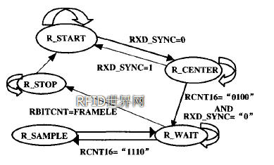 并將其轉(zhuǎn)化為并行數(shù)據(jù)輸出。接收狀態(tài)機共有R_START(等待起始位)、R_CENTER(求中點)、R_WAIT(等待采樣)、R_SAMPLE(采樣)和R_STOP(停止)這5個狀態(tài),如圖5所示。