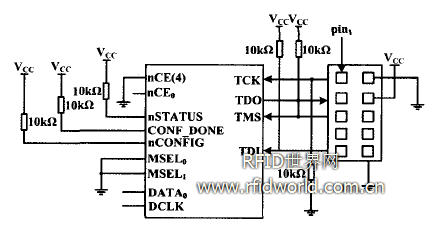 EP1C6Q240C8芯片支持被動串行和JTAG兩種下載模式 ,這里采用JTAG模式對芯片進行配置。下載電纜與電路板相連的是10針插座,采用1O個小方格來表示,配置電路如圖6所示(其中nCE0懸空,DA-TA。和DCLK使用高電平或低電平驅(qū)動)。