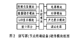 系統(tǒng)設(shè)計(jì)的重點(diǎn)在于節(jié)點(diǎn)終端設(shè)備的設(shè)計(jì),即超高頻RFID讀寫器的設(shè)計(jì)。讀寫器的主要功能是發(fā)出詢問信號,選擇能量場內(nèi)的應(yīng)答器,建立數(shù)據(jù)通信鏈路并對應(yīng)答器進(jìn)行讀寫操作。超高頻RFID讀寫器的數(shù)據(jù)采集距離較遠(yuǎn),可達(dá)到1~30 m,通過軟件設(shè)置射頻收發(fā)模塊增益大小來控制讀寫距離,靈活地滿足實(shí)際要求。讀寫器硬件按照不同的功能可劃分為主控模塊、射頻收發(fā)模塊、電源模塊、數(shù)據(jù)存儲(chǔ)模塊、接口部分、時(shí)鐘模塊、LCD顯示模塊、聲光提示模塊及調(diào)試電路等,具體如圖2所示。