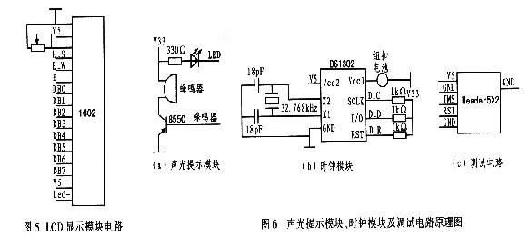(6)其他模塊1602單色液晶顯示屏,可顯示采集到的數(shù)據(jù)和操作時(shí)間或?qū)崟r(shí)時(shí)間。顯示數(shù)據(jù)的傳輸采用并行傳輸?shù)姆绞剑涌炝似聊坏乃⑿骂l率。聲光提示模塊提示操作完成情況。主要通過主控器件的I/O端口控制LED閃爍和蜂鳴器的鳴笛。時(shí)鐘模塊顯示數(shù)據(jù)采集的時(shí)間或?qū)崟r(shí)時(shí)間。除板載電源外還設(shè)計(jì)有備用的紐扣電池,使掉電時(shí)時(shí)鐘不丟失。調(diào)試電路實(shí)現(xiàn)在線編程,向主控器件C8051F340燒寫程序,監(jiān)測變量值的變化情況,調(diào)試程序,輔助完成軟件的編寫。圖5、圖6為上述模塊的原理電路圖。