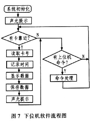 系統(tǒng)的軟件設(shè)計(jì)包括上位機(jī)軟件和下位機(jī)軟件兩部分。上位機(jī)軟件部分主要針對計(jì)算機(jī)平臺(tái),采用C++語言編寫.控制節(jié)點(diǎn)終端設(shè)備和接收節(jié)點(diǎn)終端設(shè)備發(fā)送的數(shù)據(jù),然后做進(jìn)一步處理。考慮到網(wǎng)絡(luò)的規(guī)模最大為256節(jié)點(diǎn),上位機(jī)采用輪詢方式控制各個(gè)節(jié)點(diǎn)終端設(shè)備,維持整個(gè)網(wǎng)絡(luò)正常運(yùn)行。控制節(jié)點(diǎn)終端設(shè)備的命令主要有:(1)發(fā)送數(shù)據(jù)命令:下位機(jī)接收到該命令的響應(yīng)是發(fā)送采集到的數(shù)據(jù),即緩存在數(shù)據(jù)存儲(chǔ)模塊中的數(shù)據(jù);(2)寫標(biāo)簽命令:下位機(jī)接收到該命令的響應(yīng)是向感應(yīng)區(qū)內(nèi)的標(biāo)簽寫入新的數(shù)據(jù);(3)時(shí)間設(shè)置命令:下位機(jī)的響應(yīng)是根據(jù)參數(shù)更新DS1302的數(shù)據(jù);(4)設(shè)置功率命令:設(shè)置射頻收發(fā)模塊的發(fā)射功率以調(diào)節(jié)讀寫標(biāo)簽的距離;(5)寫分機(jī)號命令:該命令為單機(jī)命令,可為每個(gè)節(jié)點(diǎn)終端設(shè)備寫入一個(gè)唯一的分機(jī)號,以便區(qū)別不同的終端設(shè)備。下位機(jī)軟件設(shè)計(jì)主要針對單片機(jī)平臺(tái),采用C語言編寫,主要是各功能模塊的驅(qū)動(dòng)程序,如射頻模塊的控制、數(shù)據(jù)存儲(chǔ)模塊的數(shù)據(jù)讀寫、時(shí)鐘模塊的輸出、LCD顯示模塊的數(shù)據(jù)顯示程序、USB接口的驅(qū)動(dòng)程序等。圖7為下位機(jī)軟件流程圖。