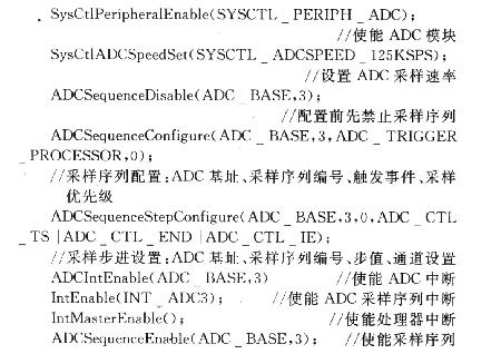 CC2420與LM3S1138的連接十分簡單,通過連接4線(SI,SO,SCLK,CSn)的同步串行接口SSI就可以方便設置芯片的工作模式,并實現讀/寫緩存數據、讀/寫狀態寄存器等。通過控制FIFO和FIFOP管腳接口的狀態可設置發射/接收緩存器。對于傳感器的使用,微處理器內嵌了溫度傳感器,擁有8通道10位ADC,采樣速率可達1 MSPS,ADC模塊含有一個可編程的序列發生器,它可在無需控制器干涉的情況下對多個模擬輸入源進行采樣。每個采樣序列均對完全可配置的輸入源、觸發事件、中斷的產生和序列優先級提供靈活的編程。如果單采集溫度信號,那么微處理器可以輕松地實現信號的采集,如需采集機械振動信息,那么只要接人相應的加速度傳感器與電荷放大器就可以實現,為了試驗方便,本課題先以溫度的測量來驗證算法的效果。由于篇幅原因,僅簡單介紹ADC初始化: