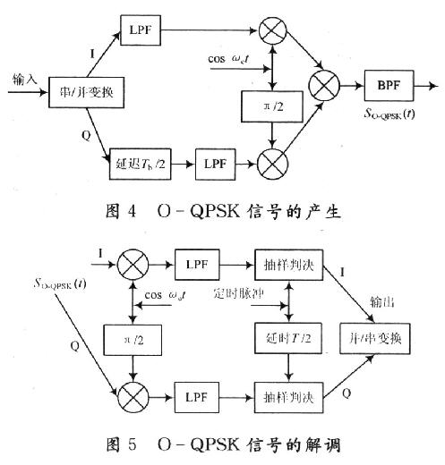 CC2420采用O-QPSK調制方式,圖4為O-QPSK信號產生電路,Tb/2的延遲電路是為了保證I,Q兩路碼元偏移半個碼元周期。BPF的作用是形成QPSK信號的頻譜形狀,保持包絡恒定。O-QPSK信號的數學表達式為: