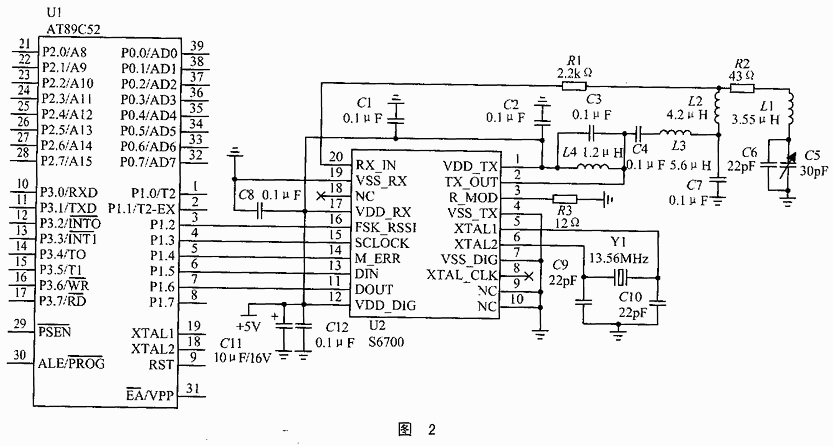 所設(shè)計的應(yīng)用電路如圖2所示。圖2中包括三個部分:ASIC典型應(yīng)用電路、與MCU接口電路和天線電路。R2、L1、C5、C6組成串聯(lián)諧振電路,匹配阻抗50Ω,可調(diào)電容C6用來準(zhǔn)確調(diào)整電路諧振點(diǎn)在13.56MHz。如果認(rèn)為ASIC 200mW輸出功率不足,也可以再加一級功放電路,以提高讀寫距離。