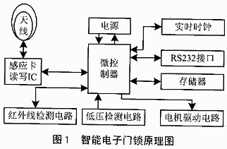 智能電子門鎖的原理如圖1所示。微控制器(MCU)采用美國(guó)Microchip公司的8位微控制器(PIC16F73)。紅外線檢測(cè)電路的作用是探測(cè)有無(wú)感應(yīng)卡靠近,每隔一定時(shí)間,發(fā)射電路會(huì)自動(dòng)射紅外線信號(hào),如有物體靠近,接收電路就會(huì)收到反射回來(lái)的紅外線信號(hào),并立即通知MCU進(jìn)行讀卡操作。感應(yīng)卡讀寫IC在MCU驅(qū)動(dòng)下,對(duì)感應(yīng)卡進(jìn)行讀操作,然后將讀到的數(shù)據(jù)曼徹斯特碼形式返回給MCU,由MCU通過(guò)程序解碼;將解碼后的卡上數(shù)據(jù)與存儲(chǔ)器中存放的鎖內(nèi)參數(shù)進(jìn)行核驗(yàn),并依據(jù)當(dāng)前時(shí)間,確定是否是有效卡;如果有效卡,則啟動(dòng)電機(jī)驅(qū)動(dòng)電路開(kāi)鎖,同時(shí)將相關(guān)信息(開(kāi)鎖記錄)存入存儲(chǔ)器。MCU通過(guò)RS232接口與手持式POS機(jī)進(jìn)行通信,從POS機(jī)接收各種設(shè)置數(shù)據(jù)、校對(duì)時(shí)間等;在必要時(shí)可將鎖內(nèi)存放的開(kāi)鎖記錄傳送給POS機(jī),然后傳遞到電腦,進(jìn)行統(tǒng)計(jì)分析。低電壓檢測(cè) 電路自動(dòng)對(duì)電池電壓進(jìn)行監(jiān)測(cè),一旦電池電壓下降到規(guī)定值,立即通知MCU,由MCU啟動(dòng)黃色低電壓提示LED,提醒客戶盡快地?fù)Q電池。電源電路在控制功耗方面起著重要作用。它在MCU的控制下為包括MCU在內(nèi)各部分電路提供電源,并可以在不同狀態(tài)下,根據(jù)實(shí)際需要改變電壓值,從而使總體功耗保持最低,延長(zhǎng)電池使用壽命。